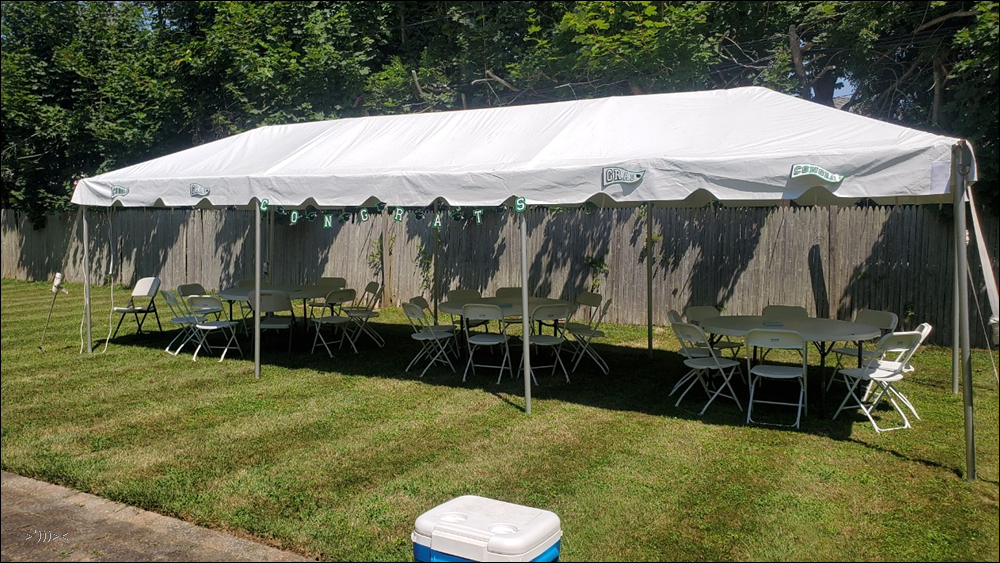 대여한 텐트. 원형테이블 3개. 의자 24개. 텐트대여업체의 직원 두명이 와서 셋팅해줬다.