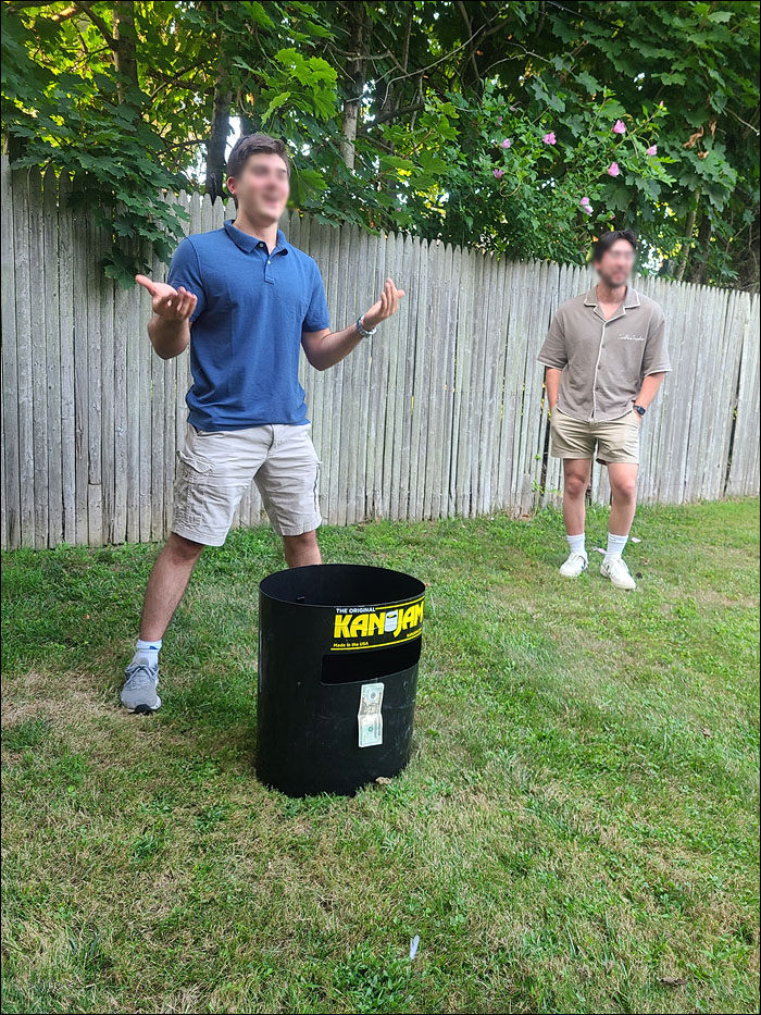 Frisbie (후리스비). 세로의 홈에 던져서 넣으면 득점하는 식이다. $20 지폐를 붙여줬더니 집중율 100%증가.