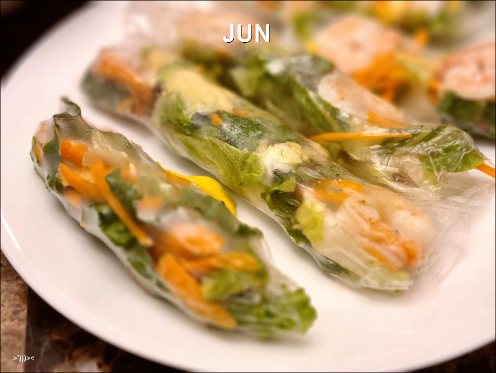 사월이의 다이어트를 위해 속이 비치는 야채가 많이 들어간 새우월남쌈.